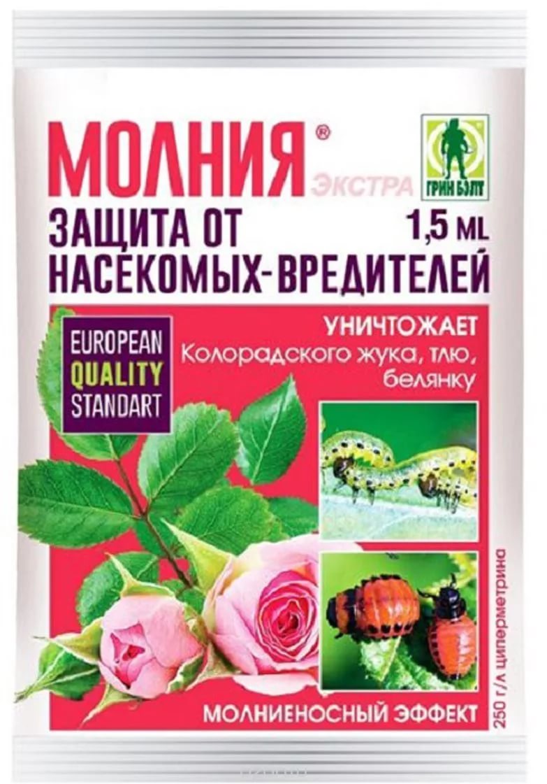 Молния экстра — инсектицид для применения в личных подсобных хозяйствах с целью защиты растений от насекомых вредителей (колорадский жук, тля, белянка и т.д.).
